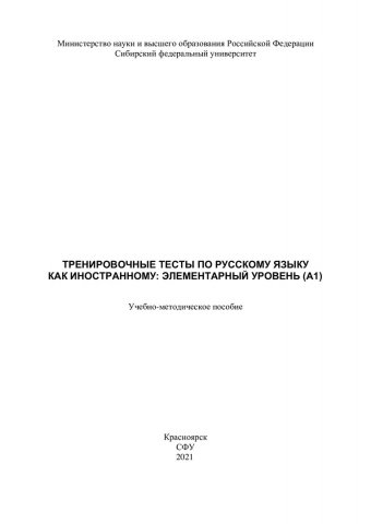 Библиографическое описание: Тренировочные тесты по русскому языку как иностранному: элементарный уровень (А1) : учебно-методическое пособие / Т. К. Веренич, А. А. Жигаева, Н. А. Маркович [и др.]. ; Сиб. федер. ун-т, Ин-т филологии и яз. коммуникации. - Электрон. текстовые дан. (pdf, 1,5 Мб). - Красноярск : СФУ, 2021 (2021-03-24). - 104 с. - Загл. с титул. экрана. - Электрон. версия печ. публикации . - 100 экз. - Изд. № 2021-13286 : Б. ц. - Текст : непосредственный : электронный.