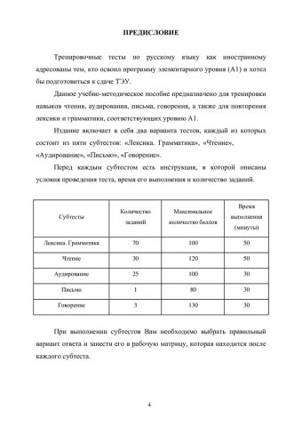 Аннотация: «Тренировочные тесты по русскому языку как иностранному: элементарный уровень (А1)» являются учебно-методическим пособием по подготовке к тестированию по пяти субтестам («Лексика. Грамматика», «Чтение», «Аудирование», «Письмо», «Говорение»). Два варианта тестов составлены в соответствии с требованиями Российской системы тестирования граждан зарубежных стран по русскому языку. Предназначено для иностранных граждан, готовящихся к сдаче ТЭУ; преподавателей русского языка как иностранного, работающих в России и за рубежом; разработчиков контрольных материалов в тестовой форме.