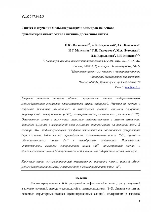 Синтез и изучение медьсодержащих полимеров на основе сульфатированного этаноллигнина древесины пихтыавторы: Васильева, Н. Ю.; Левданский, А. В.; Казаченко, А. С. и др. год: 2020 источник: Журнал СФУ. Химия база данных: Архив электронных ресурсов СФУ тип: препринт статьи