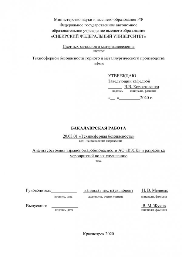 Анализ состояния взрывопожаробезопасности АО "КЗСК" и разработка мероприятий по их улучшению