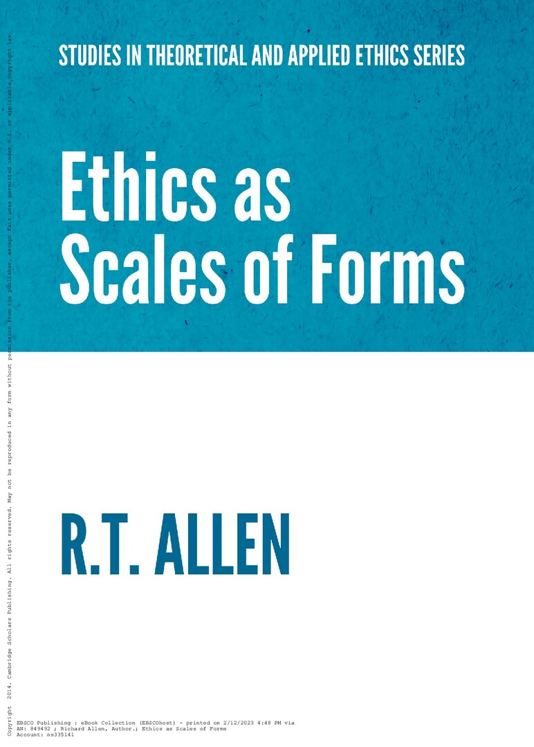Библиографическое описание: Allen, R. T. Ethics as scales of forms / R. T. Allen. - Электрон. текстовые дан. - Newcastle upon Tyne : Cambridge Scholars Publishing, 2014. - 1 online resource (211 P.). - Загл. с титул. экрана. - Includes bibliographical references and index. - ISBN 9781443867085. - ISBN 144386708X. - ISBN 1322144672. - ISBN 9781322144672 : Б. ц. - Текст : электронный. Перевод заглавия: Этика как шкала форм Примечания о происхождении: Коллекция цифровых книг Ebsco ebook (централизованная подписка 2023 г., бессрочный доступ)., НБ СФУ