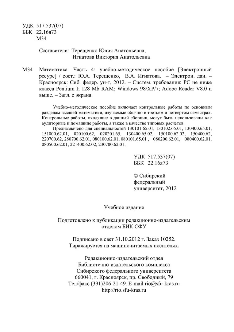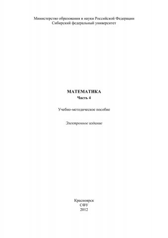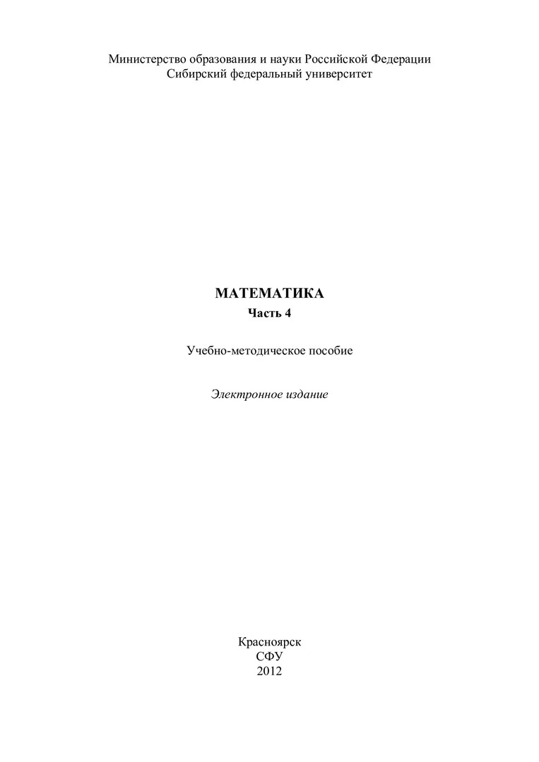 Библиографическое описание:Математика. Ч. 4 : учеб.-метод. пособие для контрол. работ [для студентов спец. 130101.65.01, 130102.65.01, 130400.65.01, 151000.62.01, 020100.62, 020201.65, 130400.65.02, 150100.62.02, 150400.62, 220700.62, 280700.62.01, 080100.62.01, 080101.65.01, 080200.62.01, 080400.62.01, 080500.62.01, 221400.62.02, 230700.62.01] / Сиб. федерал. ун-т ; сост.: Ю. А. Терещенко, В. А. Игнатова. - Электрон. текстовые дан. (PDF, 643 Мб). - Красноярск : СФУ, 2012. - Загл. с титул. экрана. - Б. ц. - Текст : непосредственный.