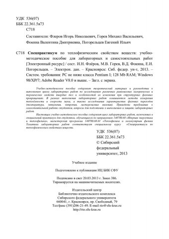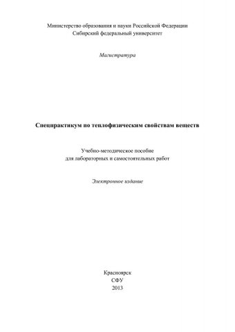 Библиографическое описание: Спецпрактикум по теплофизическим свойствам веществ : учебно-методическое пособие для лабораторных и самостоятельных работ [для студентов программы подготовки 140700.68.01 «Теплофизика и молекулярная физика»] / Сиб. федерал. ун-т ; сост. И. Н. Флеров [и др.]. - Электрон. текстовые дан. (PDF, 1,2 Мб). - Красноярск : СФУ, 2013. - (Магистратура). - Загл. с титул. экрана. - Библиогр. в конце разд. - Изд. № 2013-386 : Б. ц. - Текст : электронный.