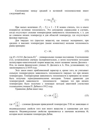 Аннотация: Учебно-методическое пособие содержит теоретический материал и руководства к выполнению цикла лабораторных работ по исследованию различных равновесных калорических и термических свойств твердых тел и особенностей их изменения при структурных фазовых превращениях. В рамках выполнения лабораторных работ осваиваются методы измерения теплоёмкости и скорости звука, а также исследования характеристик фазовых переходов (температура, энтальпия, энтропия, гистерезисные явления). Приведены требования к самостоятельной работе студентов, вопросы для подготовки к выполнению и защите лабораторных работ. Настоящее учебно-методическое пособие содержит цикл лабораторных работ, включенных в специальный практикум для студентов, обучающихся по направлению 140700.68 «Ядерная энергетика и теплофизика», магистерская программа 140700.68.01 «Теплофизика и молекулярная физика Тематика лабораторных работ соответствует специальному курсу «Спецпрактикум по теплофизическим свойствам веществ.