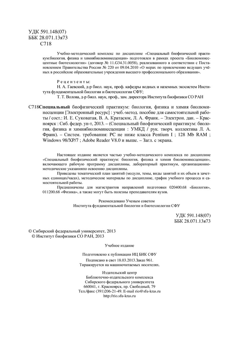 Библиографическое описание:Специальный биофизический практикум: биология, физика и химия биолюминесценции : учеб.-метод. пособие для самостоят. работы [студентов напр. подг. 020400.68 «Биология», 011200.68 «Физика»] / Сиб. федерал. ун-т. Российская академия наук [РАН]. Сибирское отделение [СО]. Институт биофизики) ; сост.: И. Е. Суковатая, В. А. Кратасюк, Л. А. Франк. - Электрон. текстовые дан. (PDF, 553 Кб). - Красноярск : СФУ, 2013. - (Магистратура). - Загл. с титул. экрана. - Библиогр.: с. 16-20. - Изд. № 2013-961 : Б. ц. - Текст : электронный.