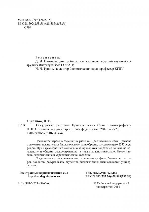Библиографическое описание: Степанов, Николай Витальевич. Сосудистые растения Приенисейских Саян : монография / Н. В. Степанов ; Сиб. федер. ун-т, Ин-т фундамент. биологии и биотехнологии. - Красноярск : СФУ, 2016. - 251 с. : цв. ил., табл. - Библиогр.: с. 245-251. - 56 экз. - ISBN 978-5-7638-3466-6 : 548.00 р. - Изд. № 2016-1254. - Текст : непосредственный + Текст : электронный.