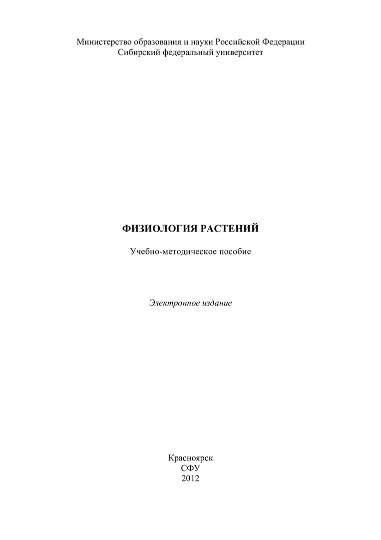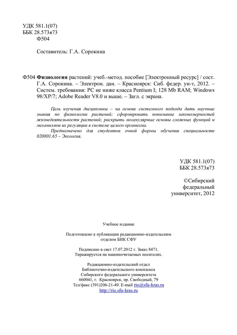 Библиографическое описание:Физиология растений : учеб.-метод. пособие [для студентов спец. 020801.65 "Экология"] / Сиб. федерал. ун-т ; сост. Г. А. Сорокина. - Электрон. текстовые дан. (PDF, 265 Кб). - Красноярск : СФУ, 2012. - Загл. с титул. экрана. - Библиогр.: с. 18-19. - Текст : электронный.