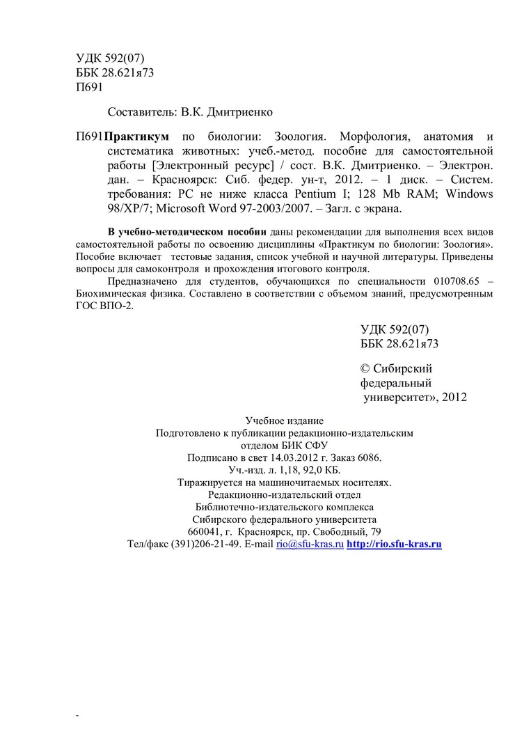 Библиографическое описание:Практикум по биологии: зоология. Морфология, анатомия и систематика животных : учеб.-метод. пособие для самостоят. работы студентов по специальности 010708.65 "Биохимическая физика" / Сиб. федерал. ун-т ; сост. В. К. Дмитриенко. - Электрон. текстовые дан. (PDF, 373 Кб). - Красноярск : Сиб. федер. ун-т, 2012. - Загл. с титул. экрана. - Библиогр.: с. 16-22. - Текст : непосредственный.