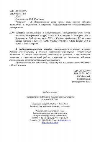 Библиографическое описание:Деловые коммуникации в международном менеджменте : учеб.-метод. пособие [для практ. занятий и самостоят. работы студентов напр. 080500.68 «Менеджмент»] / Сиб. федерал. ун-т ; сост. Е. Л. Соколова. - Электрон. текстовые дан. (PDF, 375 Кб). - Красноярск : СФУ, 2012. - Загл. с титул. экрана. - Библиогр.: с. 43. - Б. ц. - Текст : электронный.
