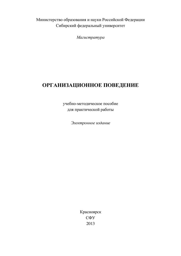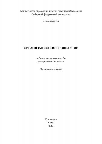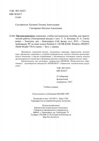Библиографическое описание:Организационное поведение : учеб.-метод. пособие для практич. работы [для студентов профиля подг. 050100.68.01 «Управление человеческими ресурсами»] / Сиб. федерал. ун-т ; сост. Т. А. Катцина. - Электрон. текстовые дан. (PDF, 837 Кб). - Красноярск : СФУ, 2013. - (Магистратура). - Загл. с титул. экрана. - Библиогр.: с. 65. - Изд. № 2013-1326. - Текст : электронный.