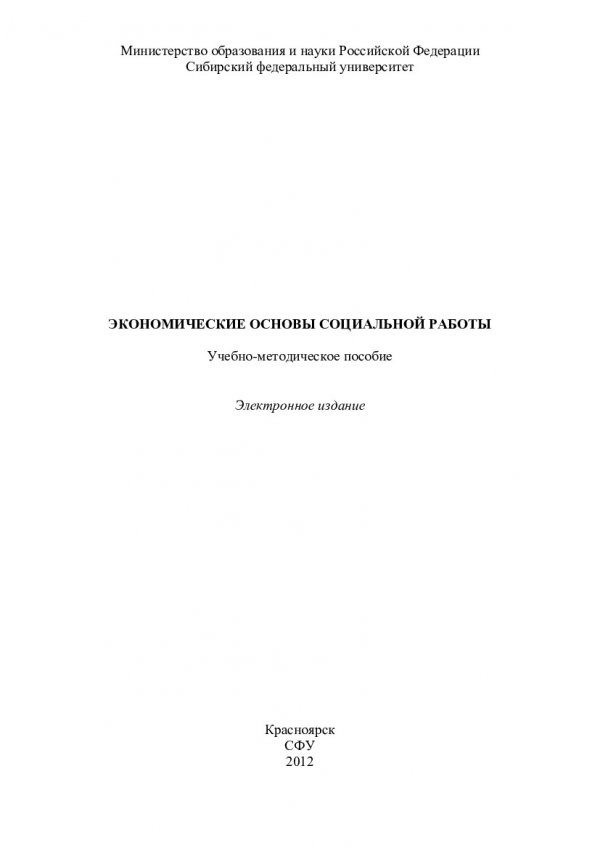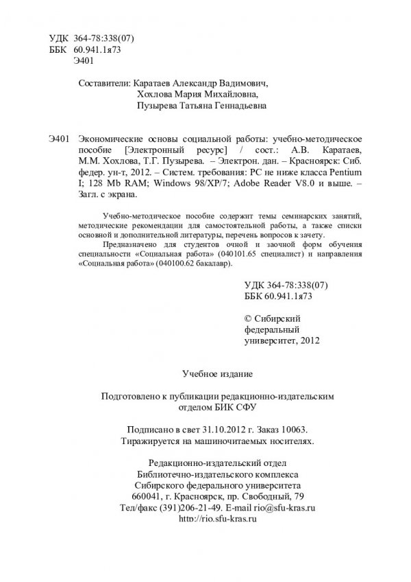 Библиографическое описание:Экономические основы социальной работы : учеб.-метод. пособие [для студентов спец. 040101.65 «Социальная работа» и напр. 040100.62 «Социальная работа»] / Сиб. федерал. ун-т ; сост.: А. В. Каратаев, М. М. Хохлова, Т. Г. Пузырева. - Электрон. текстовые дан. (PDF, 230 Кб). - Красноярск : СФУ, 2012. - Загл. с титул. экрана. - Библиогр.: с. 20-21. - Б. ц. - Текст : электронный.