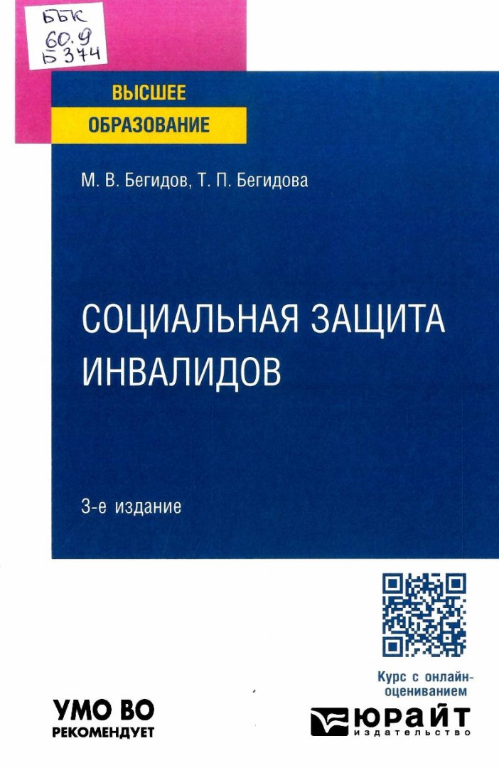 Библиографическое описание: Бегидов, Михаил Вячеславович. Социальная защита инвалидов : учебное пособие для вузов : учебное пособие для студентов вузов, обучающихся по гуманитарным направлениям / М. В. Бегидов, Т. П. Бегидова. - 3-е изд., перераб. и доп. - Москва : Юрайт, 2025. - 191 с. - (Высшее образование). - Библиогр.: с. 172-180. - ISBN 978-5-534-21309-6 (в пер.) : 353.35 р. - Текст : непосредственный. На тит. л. в подзаг.: Курс с практическими заданиями и дополнительными материалами доступен на образовательной платформе "Юрайт", а также в мобильном приложении "Юрайт.Библиотека"