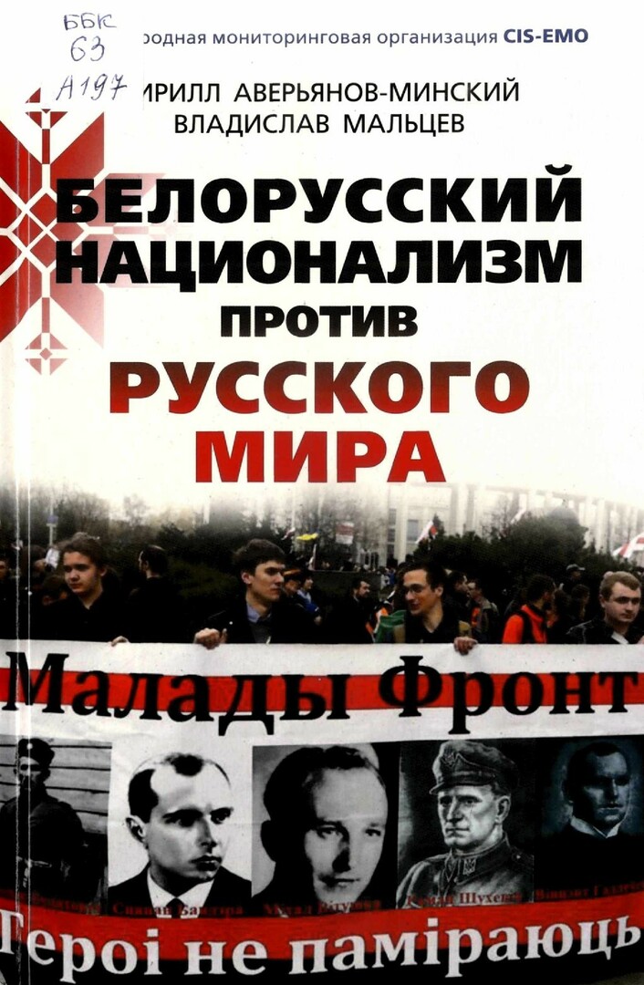 Библиографическое описание: Аверьянов-Минский, Кирилл. Белорусский национализм против русского мира / Кирилл Аверьянов-Минский, Владислав Мальцев ; Международная мониторинговая организация CIS-EMO. - Москва : [б. и.], 2015. - 190 с. : [6] л. цв. ил. - Библиогр. в подстроч. примеч. - 1000 экз. - ISBN 978-5-8041-0808-4 (в пер.) : 355.20 р. - Текст : непосредственный.