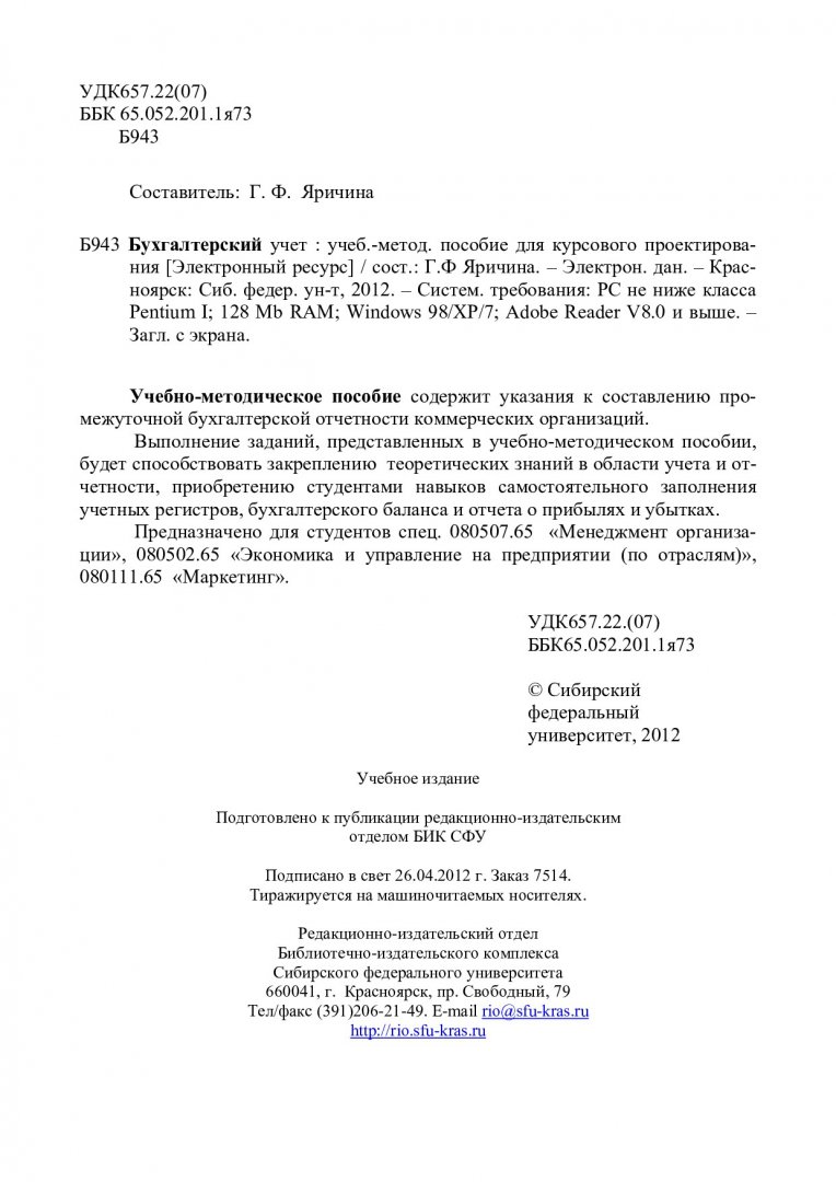 Библиографическое описание:Бухгалтерский учет : учеб.-метод. пособие для курс. проектрования [для студентов спец. 080507.65 «Менеджмент организации», 080502.65 «Экономика и управление на предприятии (по отраслям)», 080111.65 «Маркетинг»] / Сиб. федерал. ун-т ; сост. Г. Ф. Яричина. - Электрон. текстовые дан. (PDF, 314 Кб). - Красноярск : СФУ, 2012. - Загл. с титул. экрана. - Библиогр.: с. 23-24. - Текст : непосредственный.