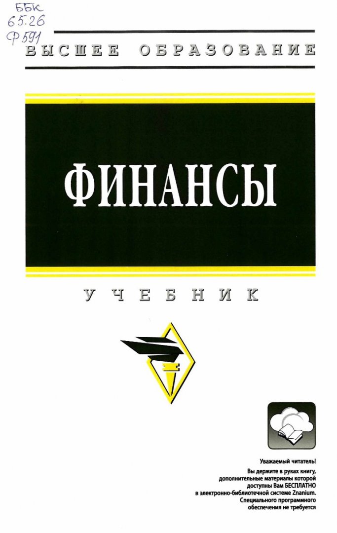 Библиографическое описание: Финансы : учебник / С. Н. Гриб, А. В. Григорьев, С. А. Козлова [и др.] ; [рец.: Е. В. Зандер, И. В. Мельман]. - Москва : ИНФРА-М, 2025 (2025-05-06). - 414 с., 25,94 усл. печ. л. : рис., табл. - (Высшее образование). - Авт. указаны на с. 3. - Библиогр.: с. 404-410. - 500 экз. - ISBN 978-5-16-020166-5 (в пер.) : 767.75 р. - Текст : непосредственный.