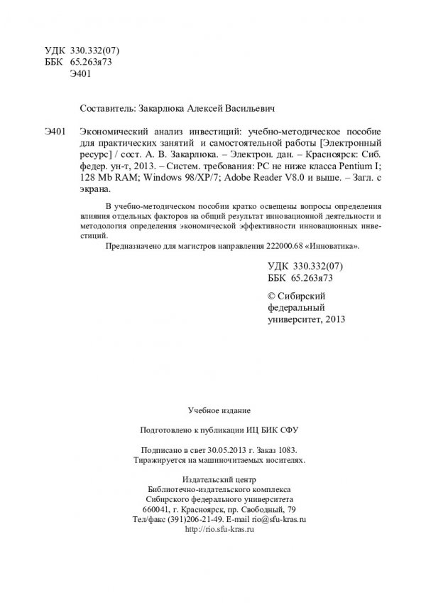 Библиографическое описание:Экономический анализ инвестиций : учебно-методическое пособие для практических занятий и самостоятельной работы [для студентов напр. 222000.68 «Инноватика»] / Сиб. федерал. ун-т ; сост. А. В. Закарлюка. - Электрон. текстовые дан. (PDF, 348 Кб). - Красноярск : СФУ, 2013. - (Магистратура). - Загл. с титул. экрана. - Изд. № 2013-1083. - Текст : электронный.