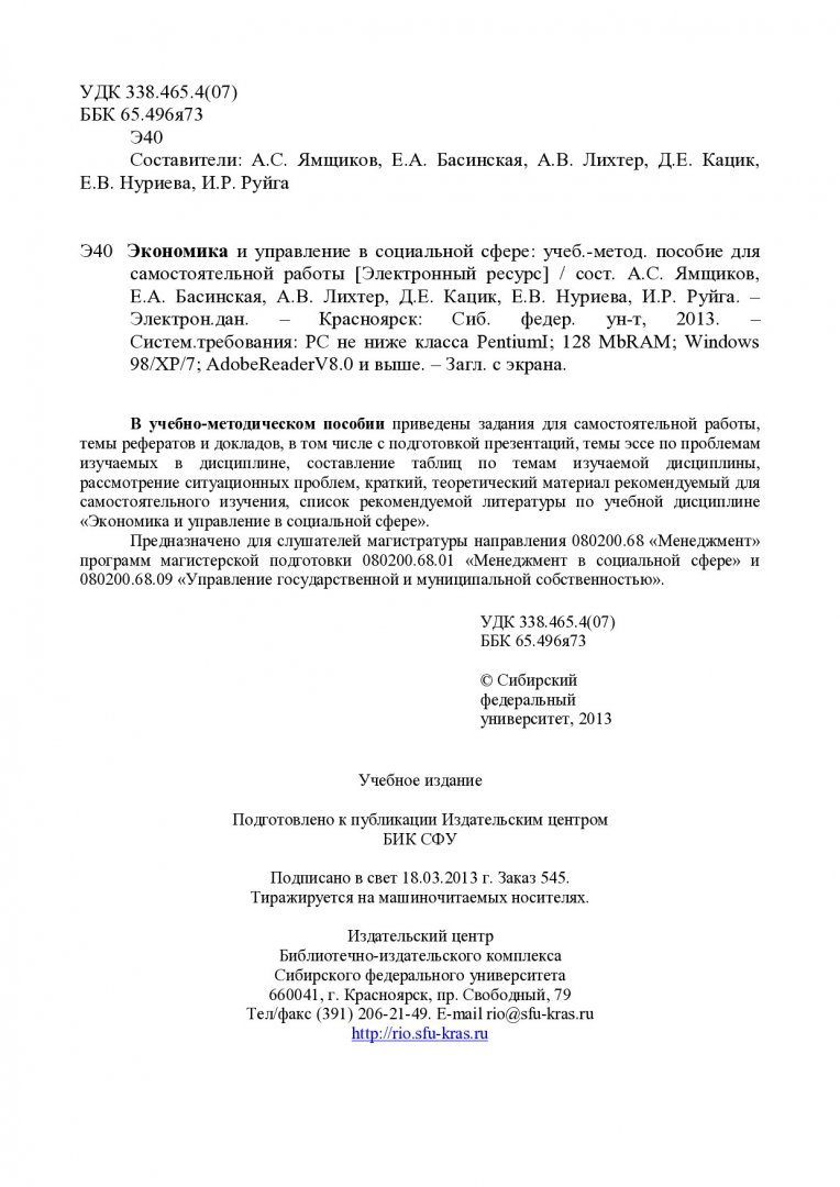 Библиографическое описание:Экономика и управление в социальной сфере : учеб.-метод. пособие для самостоят. работы [для студентов программ подгот. 080200.68.01 «Менеджмент в социальной сфере» и 080200.68.09 «Управление государственной и муниципальной собственностью»] / Сиб. федер. ун-т ; сост. А. С. Ямщиков [и др.]. - Электрон. текстовые дан. (PDF, 450 Кб). - Красноярск : СФУ, 2013. - (Магистратура). - Загл. с титул. экрана. - Библиогр. в конце глав. - Изд. № 2013-545 : Б. ц. - Текст : электронный.