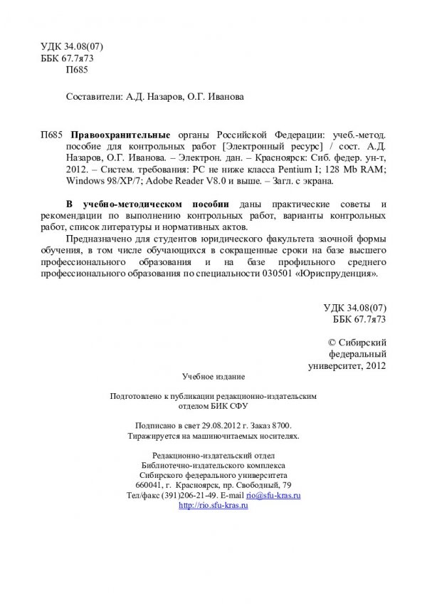 Библиографическое описание:Правоохранительные органы Российской Федерации : учеб.-метод. пособие для контрол. работ [студентов спец. 030501 «Юриспруденция» заоч. формы обучения] / Сиб. федерал. ун-т ; сост.: А. Д. Назаров, О. Г. Иванова. - Электрон. текстовые дан. (PDF, 273 Кб). - Красноярск : СФУ, 2012. - Загл. с титул. экрана. - Библиогр.: с. 11-23. - Б. ц. - Текст : электронный.
