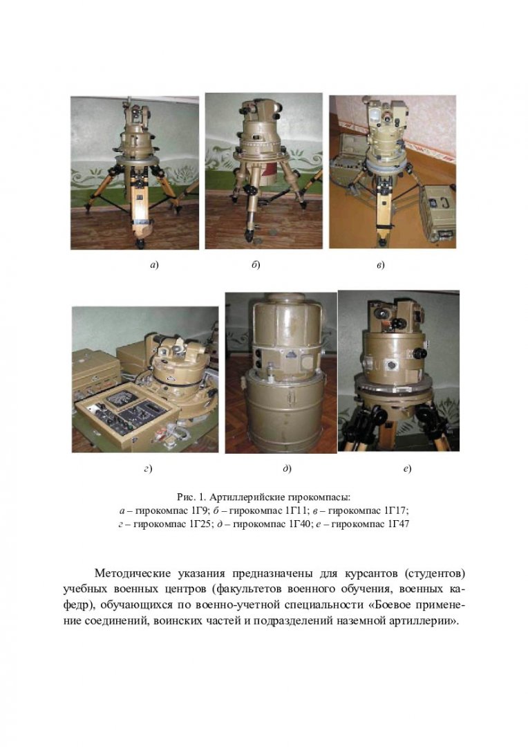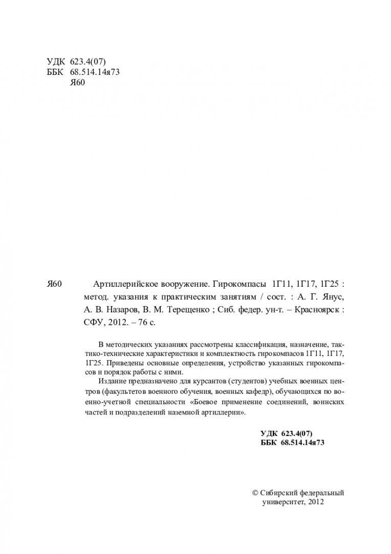 Библиографическое описание:Артиллерийское вооружение. Гирокомпасы 1Г11, 1Г17, 1Г25 : методические указания к практическим занятиям [для студентов спец. «Боевое применение соединений, воинских частей и подразделений наземной артиллерии»] / Сибирский федеральный университет (Красноярск) ; сост.: А. Г. Янус, А. В. Назаров, В. М. Терещенко. - Электрон. текстовые дан. (PDF, 2,7 Мб). - Красноярск : Сибирский федеральный университет [СФУ], 2012. - Загл. с титул. экрана. - Библиогр.: с. 69. - Изд. № 2012-8231 : Б. ц. - Текст : электронный.