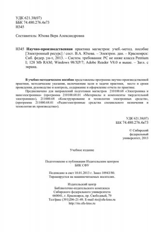 Библиографическое описание:Научно-производственная практика магистров : учеб.-метод. пособие [для студентов программ подг. 210100.68.01 «Материалы и компоненты твердотельной электроники», 211000.68.01 «Радиоэлектронные средства специального назначения и технология их производства»] / Сиб. федерал. ун-т ; сост. В. А. Юзова. - Электрон. текстовые дан. (PDF, 357 Кб). - Красноярск : СФУ, 2013. - (Магистратура). - Загл. с титул. экрана. - Библиогр.: с. 19. - Изд. № 2013-10943/80. - Текст : электронный.