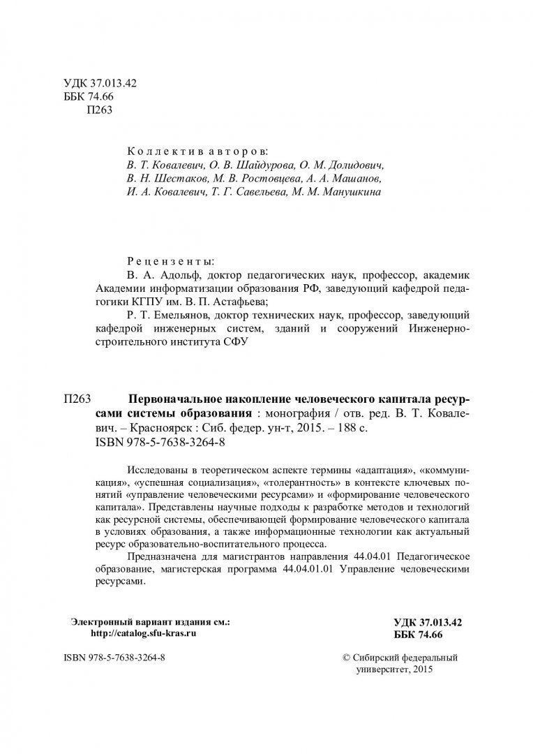 Библиографическое описание: Первоначальное накопление человеческого капитала ресурсами системы образования : коллективная монография / В. Т. Ковалевич, О. В. Шайдурова, О. М. Долидович [и др.] ; рец.: В. А. Адольф, Р. Т. Емельянов ; Сибирский федеральный университет, Институт педагогики, психологии и социологии. - Красноярск : СФУ, 2015. - 184 с. : цв. ил., табл. - Библиогр.: с. 177-184. - ISBN 978-5-7638-3264-8 : 204.00 р. - Изд. № 2015-1721. - Текст : непосредственный + Текст : электронный.