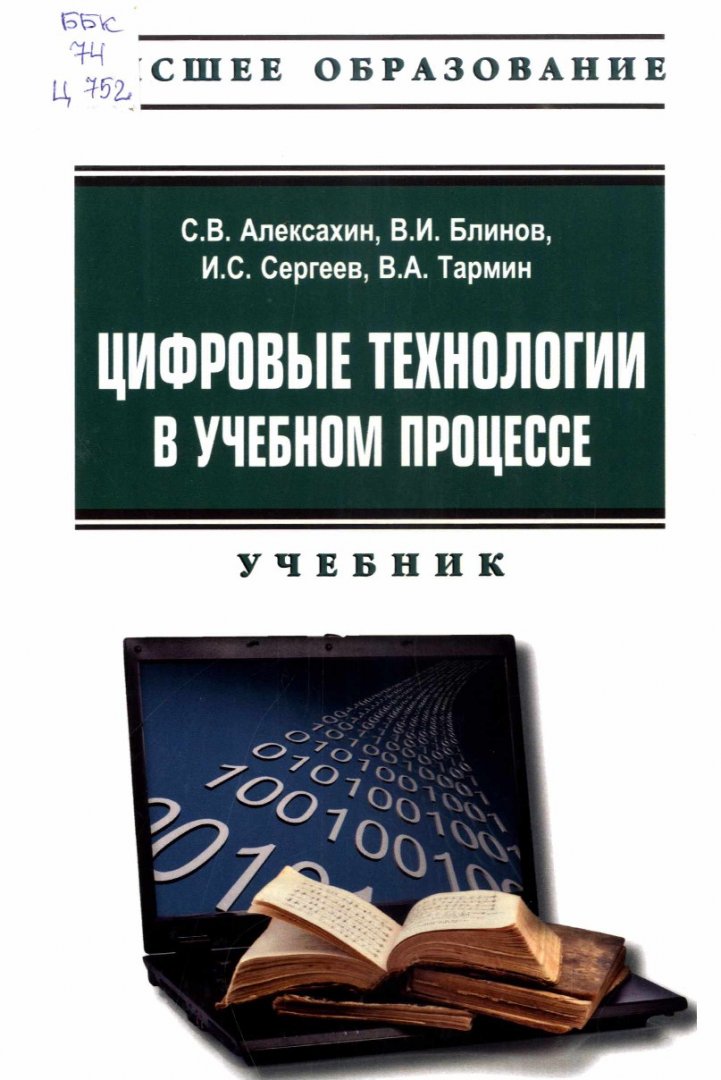 Библиографическое описание: Цифровые технологии в учебном процессе : учебник (с электронными приложениями) / С. В. Алексахин, В. И. Блинов, И. С. Сергеев, В. А. Тармин. - 2-е изд. - Москва : РИОР : ИНФРА-М, 2025. - 330 с. : ил., табл. - (Высшее образование). - Библиогр.: с. 329-330. - 500 экз. - ISBN 978-5-369-01970-2 (в пер.) : 2024.00 р. - Текст : непосредственный.