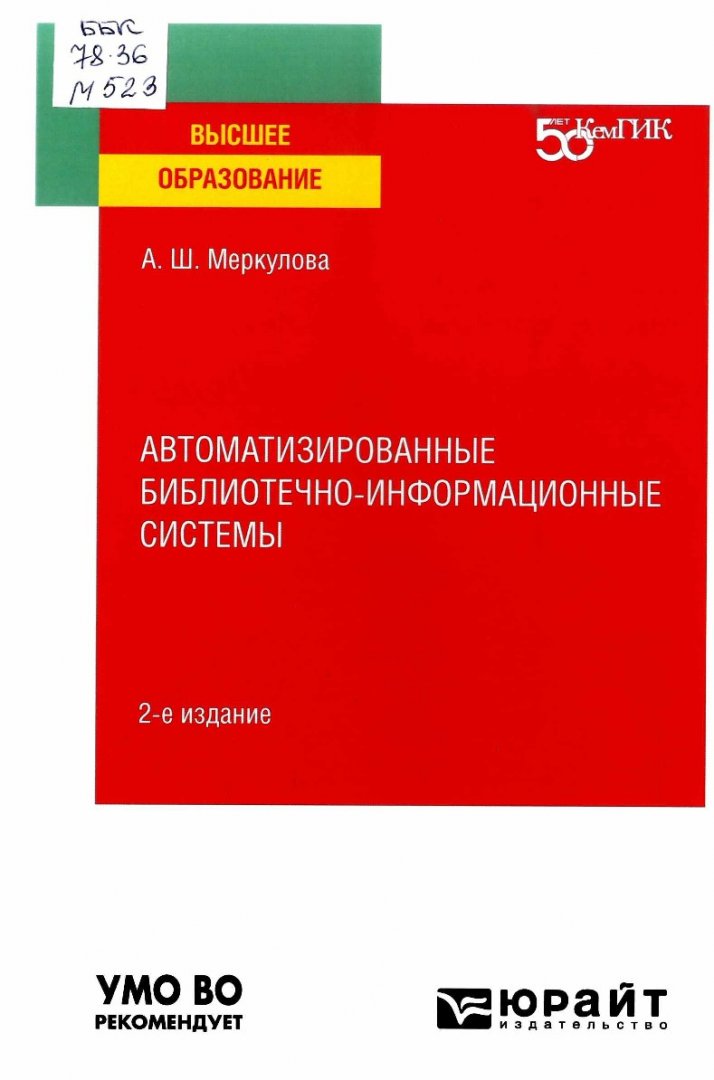 Библиографическое описание: Меркулова, Альмира Шевкетовна. Автоматизированные библиотечно-информационные системы : учебное пособие для вузов: учебное пособие для студентов вузов, обучающихся по гуманитарным направлениям / А. Ш. Меркулова. - 2-е изд. - Москва : Юрайт, 2024. - 129 с. : табл. - (Высшее образование). - Библиогр.: с. 64-68. - ISBN 978-5-534-14852-7 : 119.97 р. - Текст : непосредственный. На обл. : 50 лет КемГИК. На тит. л. в подзаг.: Курс с практическими заданиями и дополнительными материалами доступен на образовательной платформе "Юрайт", а также в мобильном приложении "Юрайт.Библиотека"