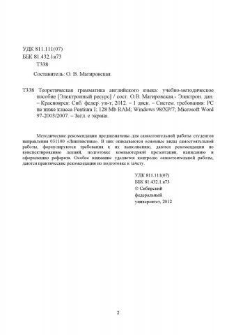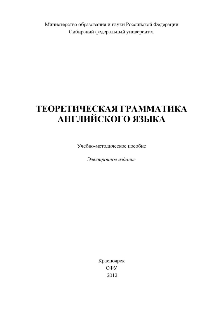 Библиографическое описание:Теоретическая грамматика английского языка : учеб.-метод. пособие для самостоят. работы студентов напр. 031100 «Лингвистика» / Сиб. федерал. ун-т ; сост. О. В. Магировская. - Электрон. текстовые дан. (PDF, 258 Кб). - Красноярск : Сиб. федер. ун-т, 2012. - Загл. с титул. экрана. - Текст : электронный.