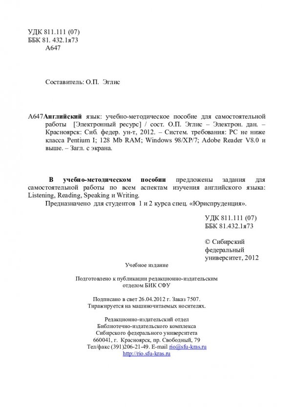 Библиографическое описание:Английский язык : учеб.-метод. пособие для самост. работы студентов 1 и 2 курса спец. «Юриспруденция». / Сиб. федерал. ун-т ; сост. О. П. Эглис. - Электрон. текстовые дан. (PDF, 288 Кб). - Красноярск : СФУ, 2012. - Загл. с титул. экрана. - Библиогр.: с. 25. - ISSN http://li. - Текст : электронный.