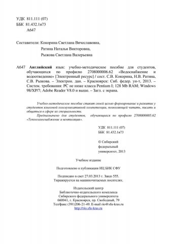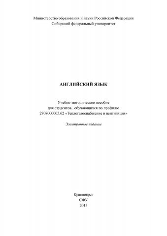 Библиографическое описание:Английский язык : учеб.-метод. пособие для студентов, обучающихся по профилю 2708000005.62 «Теплогазоснабжение и вентиляция» / Сиб. федерал. ун-т ; сост.: С. В. Кокорина, Н. В. Ратина, С. В. Рыжова. - Электрон. текстовые дан. (PDF, 1,8 Мб). - Красноярск : СФУ, 2013. - Загл. с титул. экрана. - Библиогр.: с. 143-144. - Изд. № 2013-555. - Текст : электронный.
