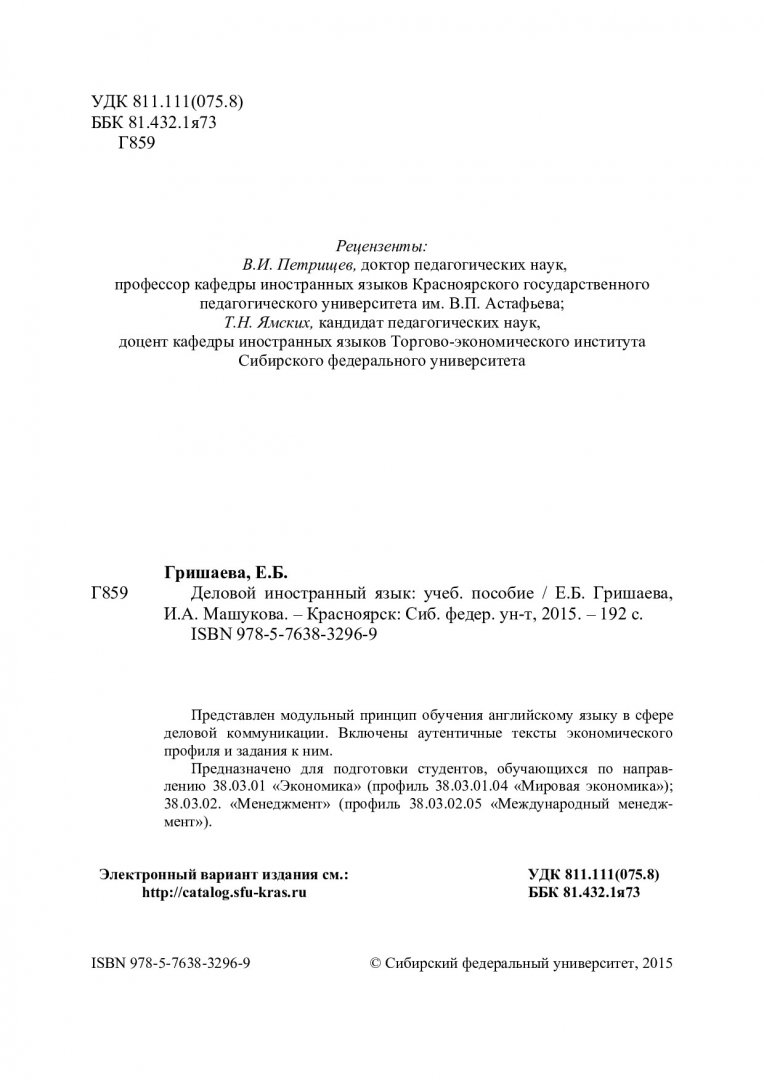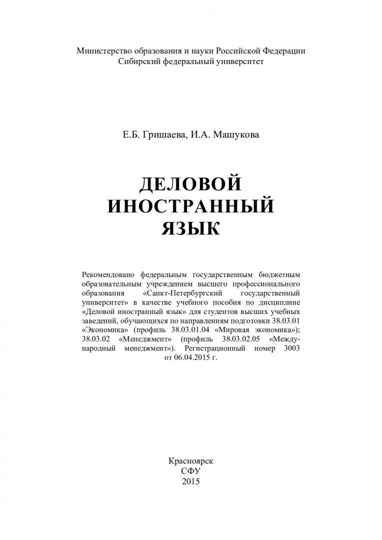 Библиографическое описание:Гришаева, Елена Борисовна. Деловой иностранный язык : учебное пособие по дисциплине "Деловой иностранный язык" для студентов вузов по направлениям подготовки 38.03.01 "Экономика"; 38.03.02 "Менеджмент" / Е. Б. Гришаева, И. А. Машукова ; Сиб. федер. ун-т, Ин-т экономики, упр. и природопользования. - Красноярск : СФУ, 2015. - 191 с. - Библиогр.: с. 189-191. - ISBN 978-5-7638-3296-9 : 180.00 р. - Изд. № 2015-2263. - Текст : непосредственный + Текст : электронный.