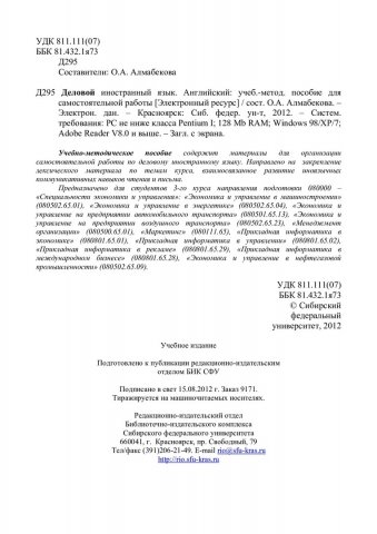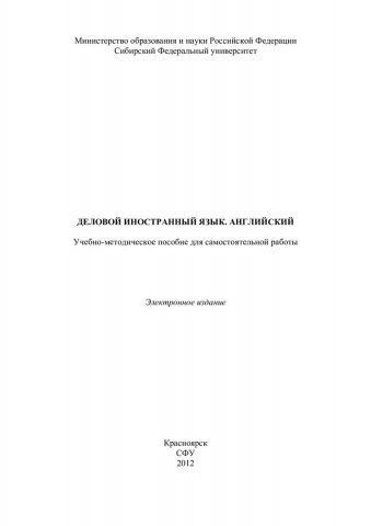 Библиографическое описание:Деловой иностранный язык. Английский : учеб.-метод. пособие для самостоят. работы [для студентов 3 курса напр. подг. 080000 «Специальности экономики и управления»] / Сиб. федерал. ун-т ; сост. О. А. Алмабекова. - Электрон. текстовые дан. (PDF, 313 Кб). - Красноярск : СФУ, 2012. - Загл. с титул. экрана. - Б. ц. - Текст : электронный.