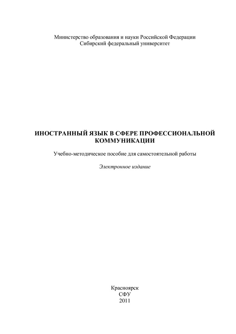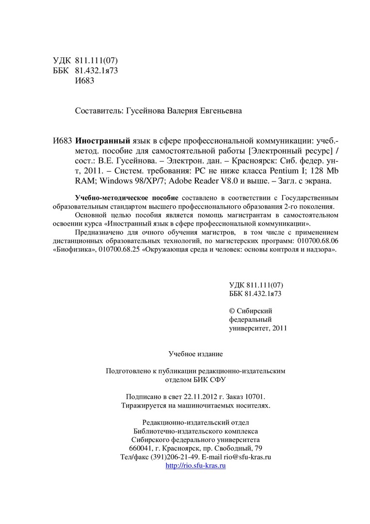 Библиографическое описание:Иностранный язык в сфере профессиональной коммуникации : учеб.-метод. пособие для самостоят. работы [для студентов спец. 010700.68.06 «Биофизика», 010700.68.25 «Окружающая среда и человек: основы контроля и надзора»] / Сиб. федерал. ун-т ; сост. В. Е. Гусейнова. - Электрон. текстовые дан. (PDF, 198 Кб). - Красноярск : СФУ, 2011. - Загл. с титул. экрана. - Библиогр.: с. 10-12. - Текст : электронный.