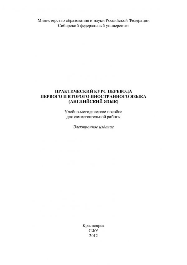 Библиографическое описание:Практический курс перевода первого и второго иностранного языка (английский язык) : учеб.-метод. пособие для самост. работы / Сиб. федерал. ун-т ; сост.: В. В. Обидина, В. А. Кононова. - Электрон. текстовые дан. (PDF, 273 Кб). - Красноярск : СФУ, 2012. - Загл. с титул. экрана. - Библиогр.: с. 7-9. - Б. ц. - Текст : электронный.