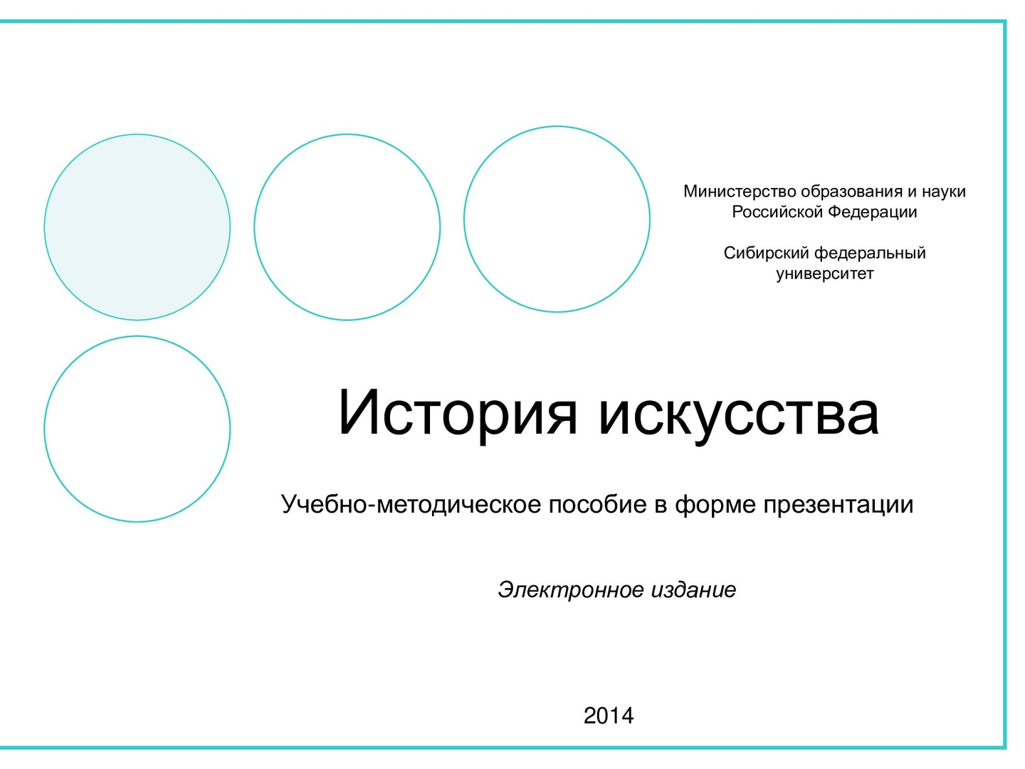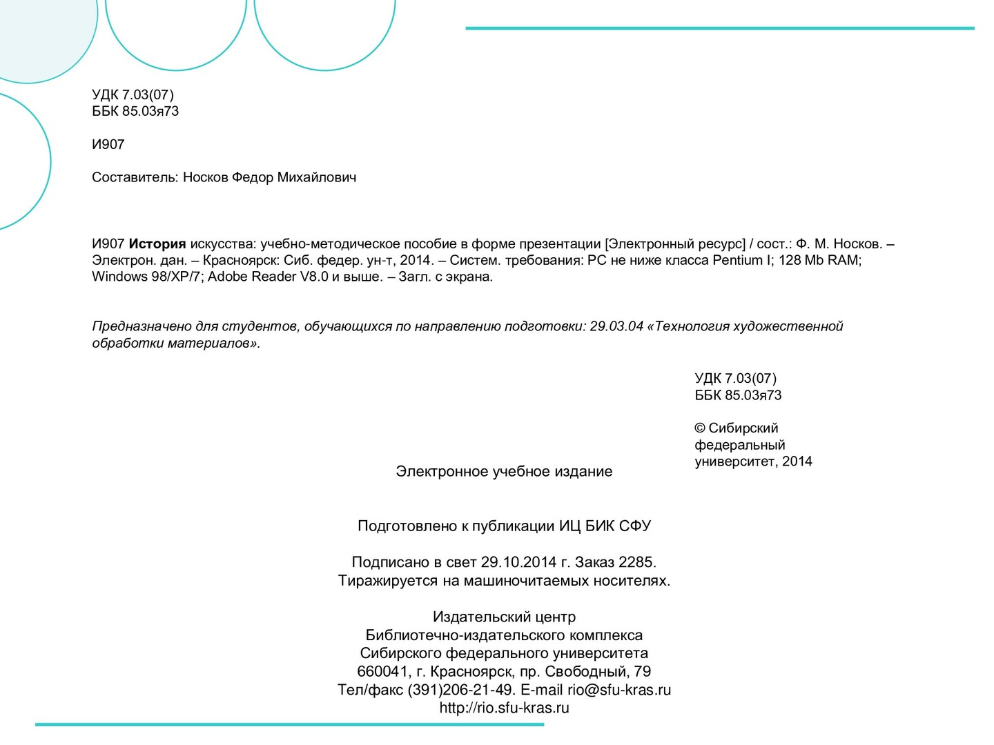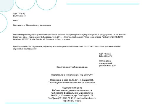 Библиографическое описание:История искусства : учеб.-метод. пособие в форме презентации [для студентов напр. 29.03.04 "Технология художественной обработки материалов"] / Сиб. федер. ун-т, Политехн. ин-т ; сост. Ф. М. Носков. - Электрон. текстовые дан. (PDF, 29 Мб). - Красноярск : СФУ, 2014. - Загл. с титул. экрана. - Изд. № 2014-2285. - Текст : непосредственный.
