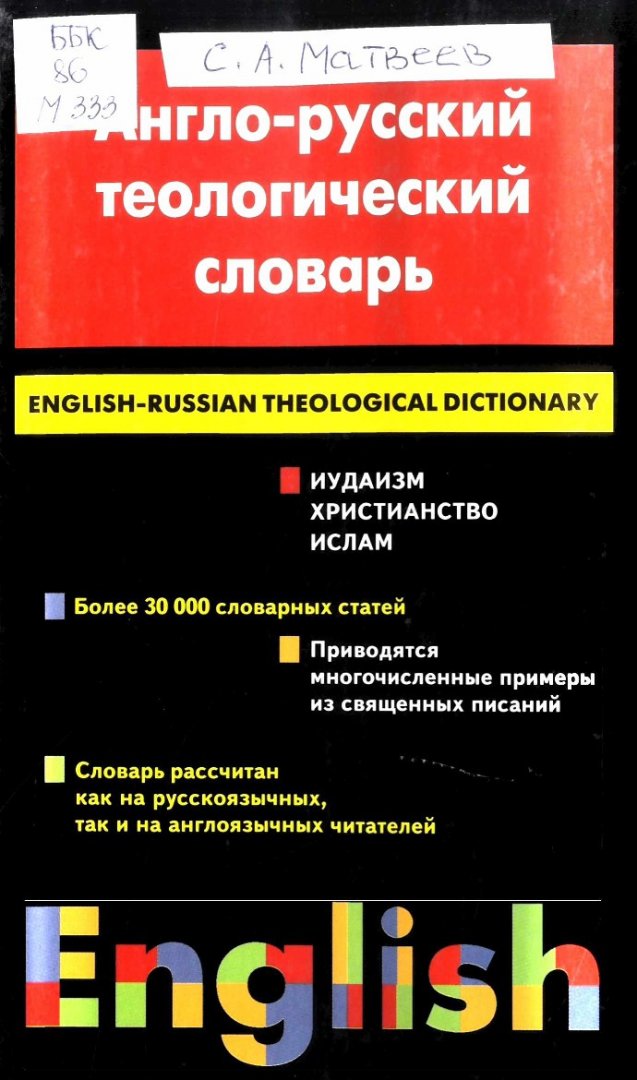 Библиографическое описание:Матвеев, Сергей Александрович. Англо-русский теологический словарь = English-russian theological dictionary : иудаизм - христианство - ислам : около 30 000 слов / С. А. Матвеев. - Москва : АСТ : Восток-Запад, 2006. - 758 с. - (English). - На обл. авт. не указан. - ISBN 5-17-038449-1 (в пер.) : 250.00 р. - Текст : непосредственный.