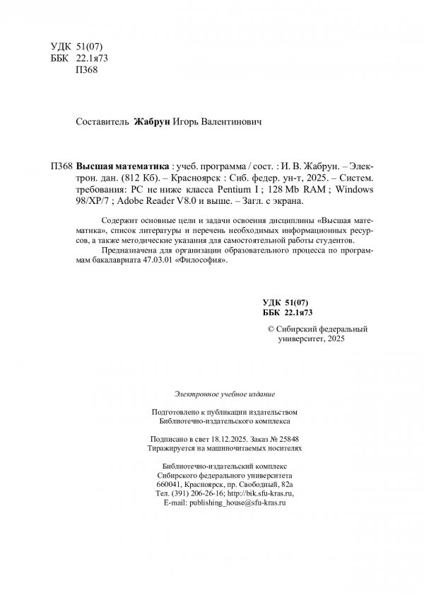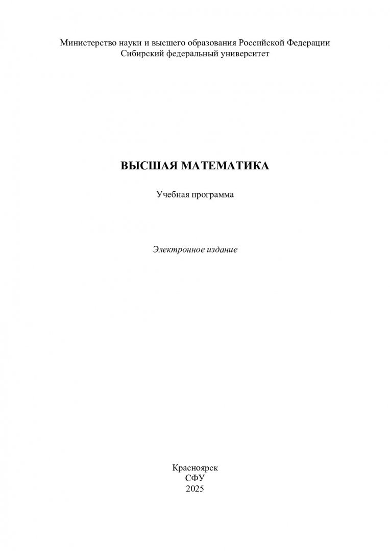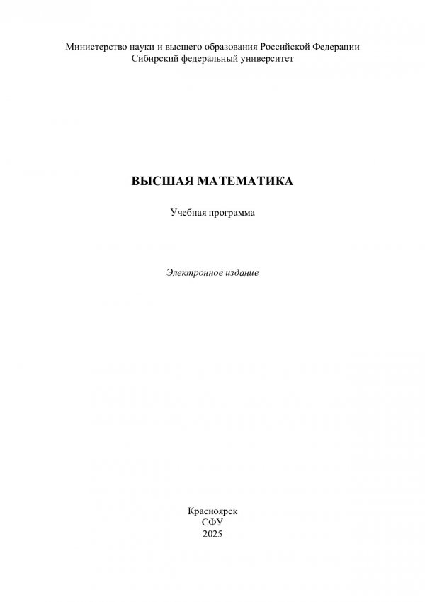 Библиографическое описание:Высшая математика : учебная программа / Сибирский федеральный университет ; сост. И. В. Жабрун. - Электрон. текстовые дан. (pdf, 0.9 Мб). - Красноярск : СФУ, 2025 (2025-12-18). - 27 с. - Загл. с титул. экрана. - Изд. № 2025-25848 : Б. ц. - Текст : электронный.