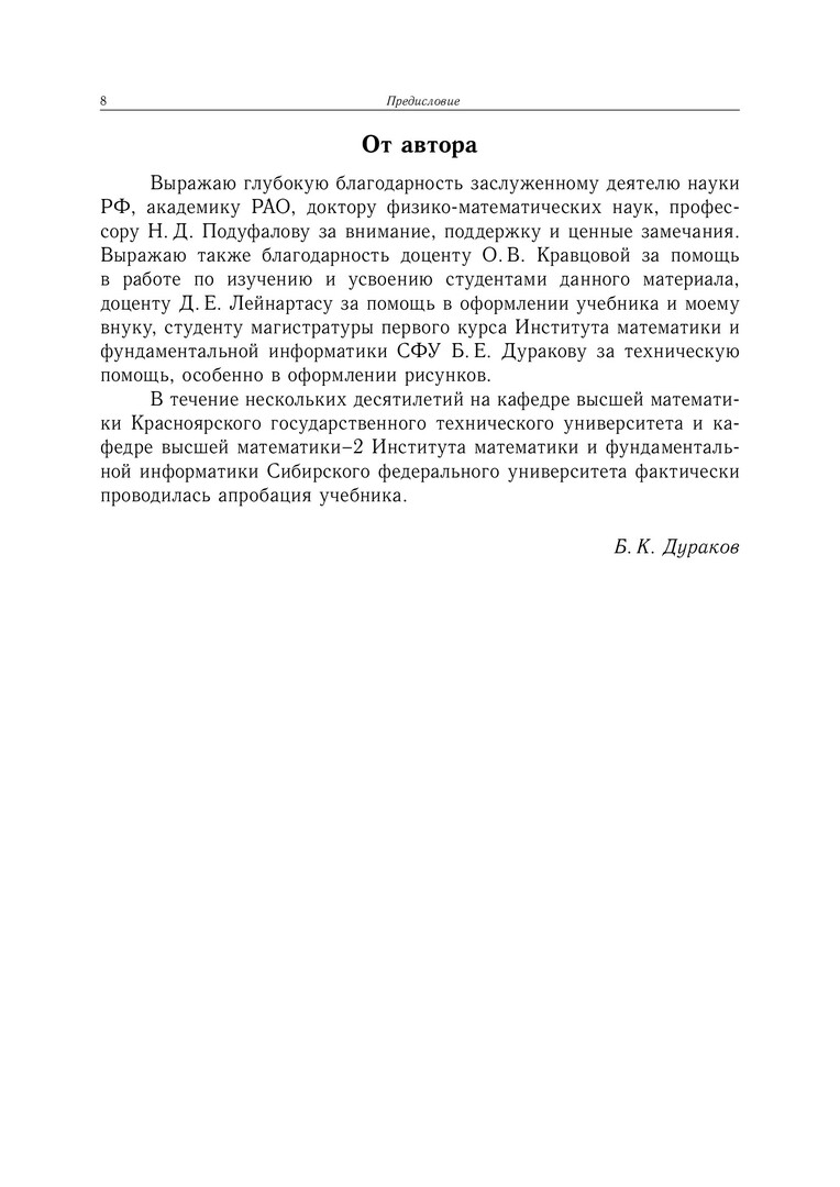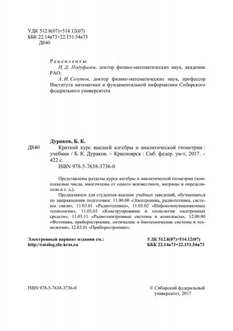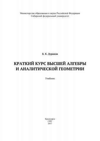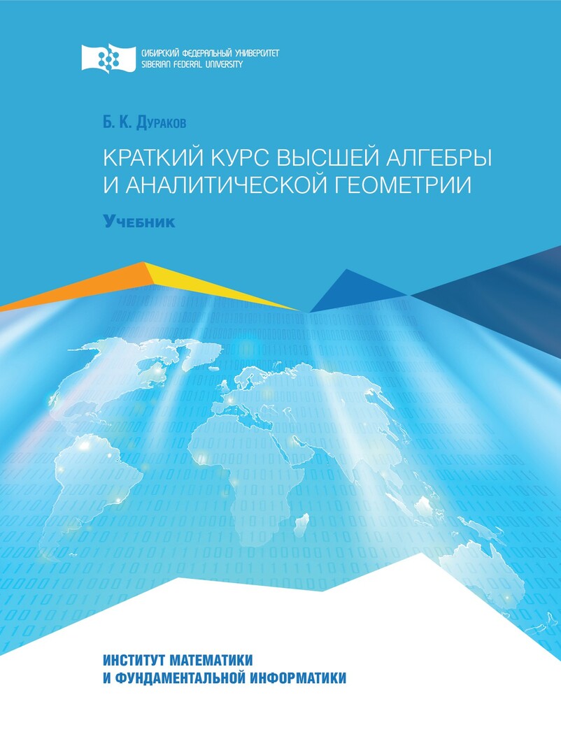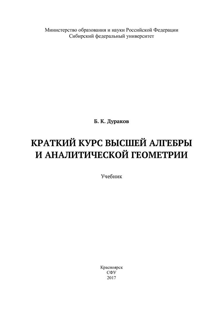 Библиографическое описание: Дураков, Борис Константинович. Краткий курс высшей алгебры и аналитической геометрии : учебник / Б. К. Дураков ; Сиб. федер. ун-т, Ин-т математики и фундамент. информатики. - Красноярск : СФУ, 2017. - 421 с. : ил. - Библиогр.: с. 421. - 100 экз. - ISBN 978-5-7638-3736-0 : 523.00 р. - Изд. № 2017-2253. - Текст : непосредственный + Текст : электронный.