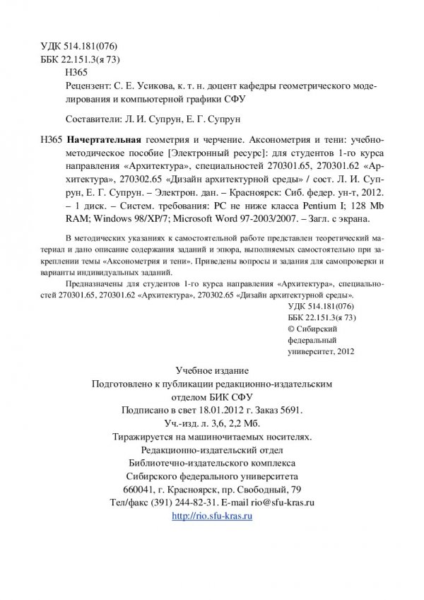 Библиографическое описание:Начертательная геометрия и черчение. Аксонометрия и тени : учебно-методическое пособие для студентов 1 курса напр. "Архитектура", спец. 270301.65 "Архитектура", 270302.65 "Дизайн архитектурной среды" / Сиб. федерал. ун-т ; сост.: Л. И. Супрун, Е. Г. Супрун. - Электрон. текстовые дан. (PDF, 3,3 Мб). - Красноярск : СФУ, 2012. - Загл. с титул. экрана. - Библиогр.: с. 61. - Текст : электронный.
