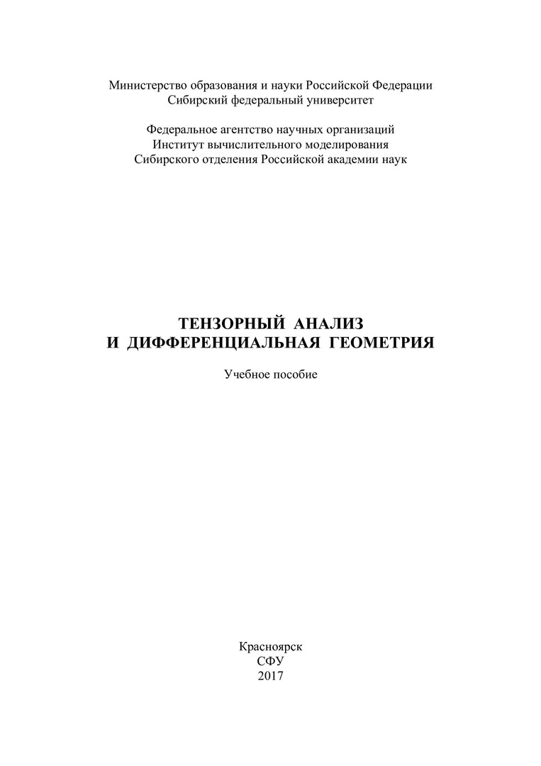 Библиографическое описание:Тензорный анализ и дифференциальная геометрия : учебное пособие [для студентов напр. подготовки 15.03.03 «Прикладная математика» и 15.03.01 «Машиностроение»] / И. В. Киреев [и др.]. ; Сиб. федер. ун-т, Ин-т математики и фундамент. информатики, Рос. акад. наук, Сиб. отд-ние, Ин-т вычисл. моделирования. - Красноярск : СФУ, 2017. - 100 с. - Библиогр.: с. 100. - 100 экз. - ISBN 978-5-7638-3622-6 : 144.00 р. - Изд. № 2017-280. - Текст : непосредственный + Текст : электронный.