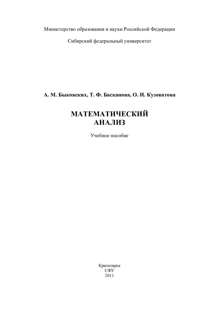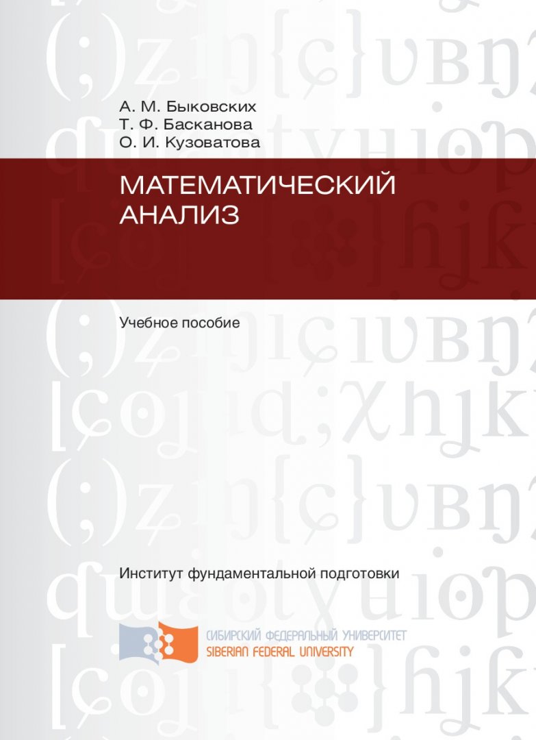 Библиографическое описание: Быковских, Анатолий Михайлович. Математический анализ : учеб. пособие для вузов / А. М. Быковских, Т. Ф. Басканова, О. И. Кузоватова ; Сиб. федер. ун-т, Ин-т фундамент. подготовки. - Красноярск : СФУ, 2011. - 151 с. - Библиогр.: с. 151. - 200 экз. - ISBN 978-5-7638-2431-5. - Текст : непосредственный + Текст : электронный.