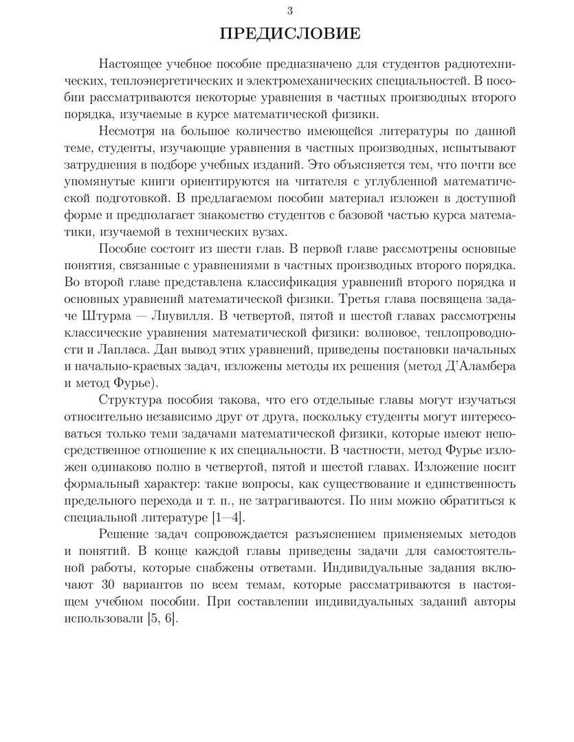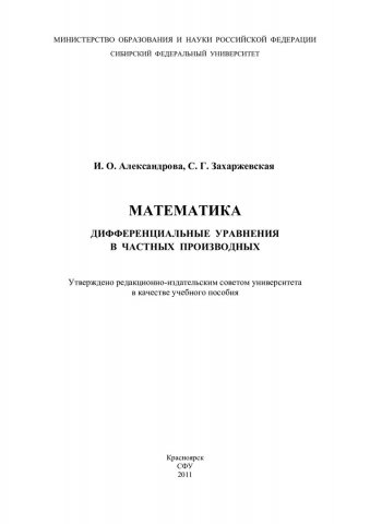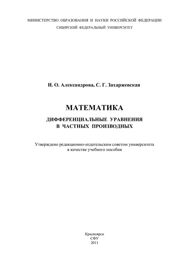 Библиографическое описание: Александрова, Инна Олеговна. Математика. Дифференциальные уравнения в частных производных : учеб. пособие / И. О. Александрова, С. Г. Захаржевская ; Сиб. федерал. ун-т. - Красноярск : ИПК СФУ, 2011. - 85 с. - Библиогр.: с. 84. - 300 экз. - ISBN 978-5-7638-2176-5. - Текст : непосредственный + Текст : электронный.