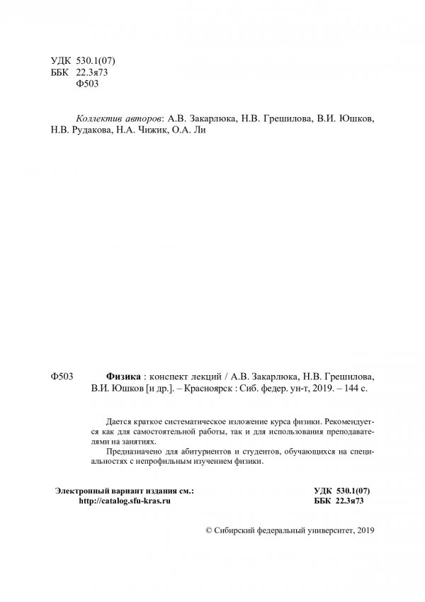 Библиографическое описание: Физика : конспект лекций / А. В. Закарлюка [и др.]. ; Сиб. федер. ун-т, Политехн. ин-т. - Красноярск : СФУ, 2019. - 144 с. : ил. - 100 экз. - Изд. № 2019-7736 : Б. ц. - Текст : непосредственный + Текст : электронный.