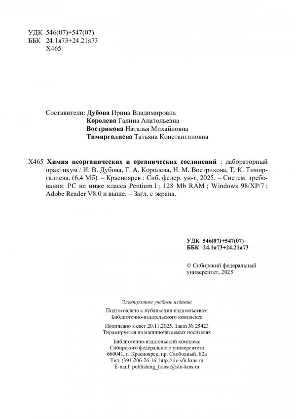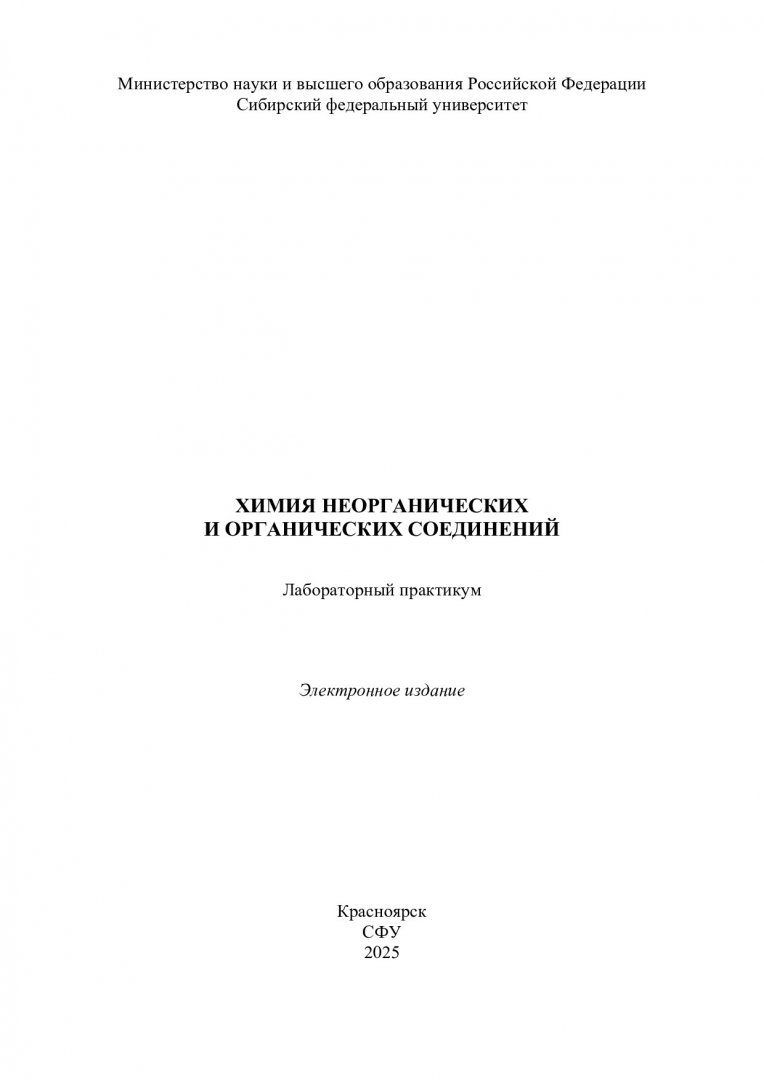 Библиографическое описание: Химия неорганических и органических соединений : лабораторный практикум : учебно-методическое пособие / Сибирский федеральный университет, Институт цветных металлов ; сост.: И. В. Дубова, Г. А. Королева, Н. М. Вострикова, Т. К. Тимиргалиева. - Электрон. текстовые дан. (pdf, 6.8 Мб). - Красноярск : СФУ, 2025 (2025-11-20). - 205 с. : ил., табл. - Загл. с титул. экрана. - Библиогр.: с. 202-203. - Изд. № 2025-25423 : Б. ц. - Текст : электронный.