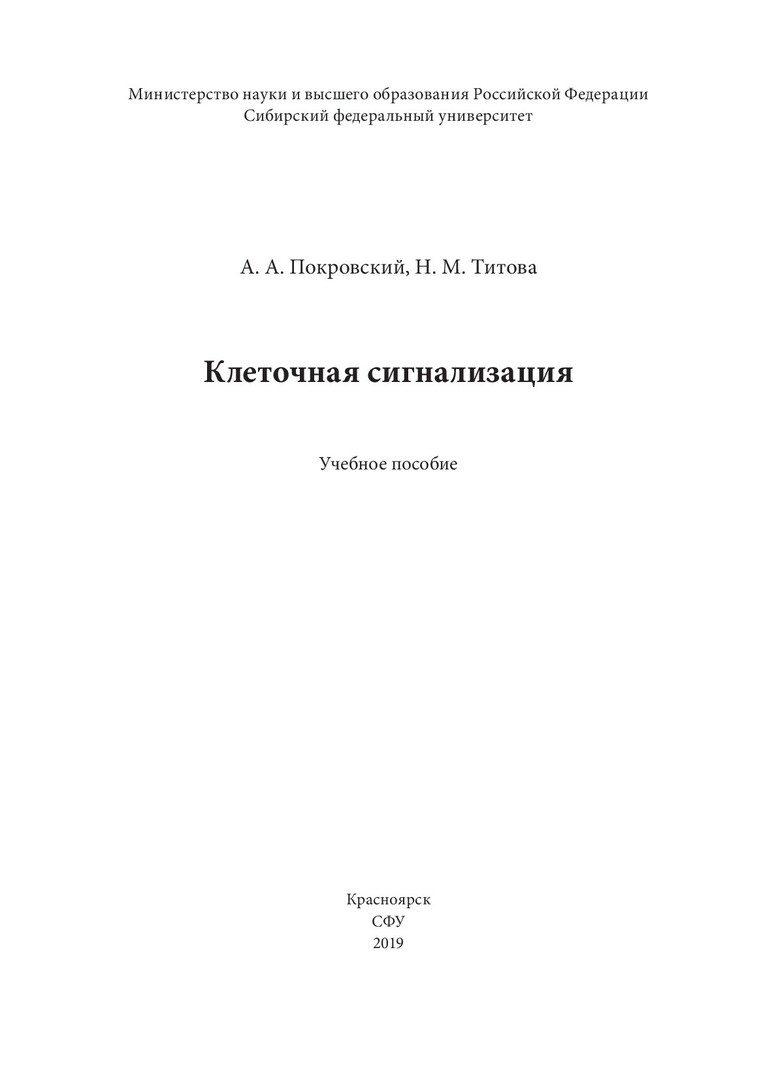 Библиографическое описание: Покровский, Артемий Александрович. Клеточная сигнализация : учебное пособие / А. А. Покровский, Н. М. Титова ; Сиб. федер. ун-т, Ин-т фундамент. биологии и биотехнологии. - Красноярск : СФУ, 2019 (2010-09-28). - 114 с. : цв. ил. - Библиогр.: с. 106-114. - 100 экз. - ISBN 978-5-7638-4053-7 : 503.00 р. - Изд. № 2018-7279. - Текст : непосредственный + Текст : электронный.