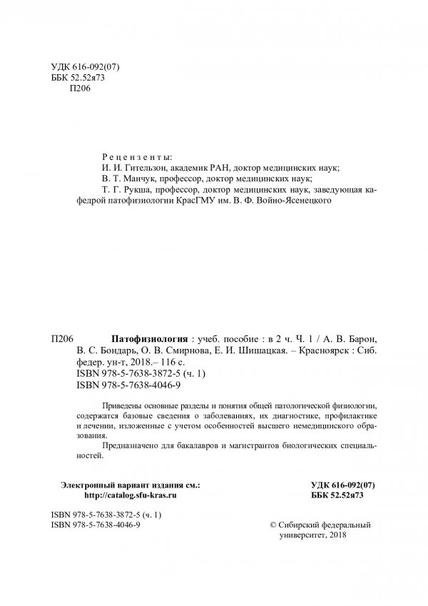 Библиографическое описание:Патофизиология : учебное пособие: в 2-х ч. / Сиб. федер. ун-т, Ин-т фундамент. биологии и биотехнологии. - Красноярск : СФУ, 2018 - 2019. - ISBN 978-5-7638-4046-9. - Текст : непосредственный. + Текст : электронный. Ч. 1 / А. В. Барон [и др.]. - Красноярск : СФУ, 2018. - 114 с. : ил. - Библиогр.: с. 112-113. - 100 экз. - ISBN 978-5-7638-3872-5 : 251.00 р. - Изд. № 2018-4385