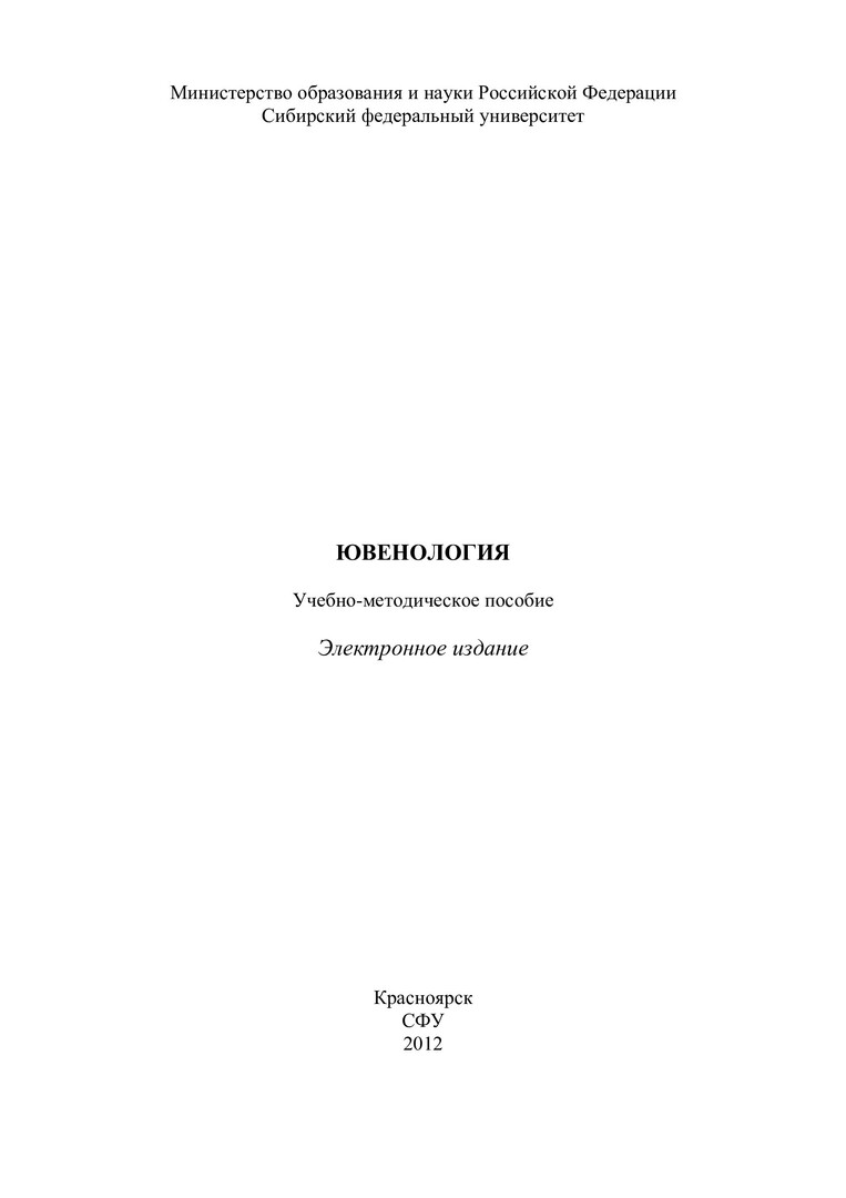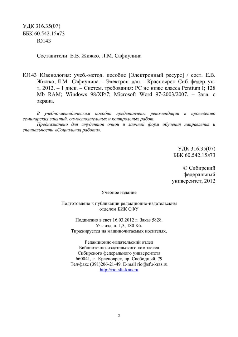 Библиографическое описание:Ювенология : учеб.-метод. пособие к семинар. занятиям / Сиб. федерал. ун-т ; сост.: Е. В. Жижко, Л. М. Сафиулина. - Электрон. текстовые дан. (PDF, 300 Кб). - Красноярск : Сиб. федер. ун-т, 2012. - Загл. с титул. экрана. - Библиогр.: с. 12-16. - Текст : электронный.