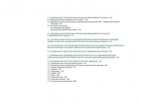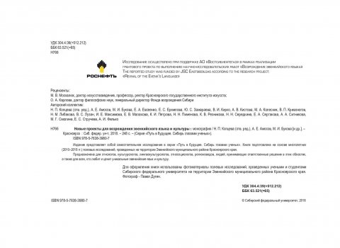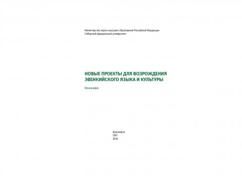 Библиографическое описание: Новые проекты для возрождения эвенкийского языка и культуры : монография / Сибирский федеральный университет, Гуманитарный институт ; отв. ред. Н. П. Копцева. - Красноярск : СФУ, 2018. - 246 с. : цв. ил., табл. - (Путь в будущее: Сибирь глазами ученых). - Библиогр.: с. 223-237. - 500 экз. - ISBN 978-5-7638-3980-7 (в пер.) : 2001.00 р. - Изд. № 2018-5966