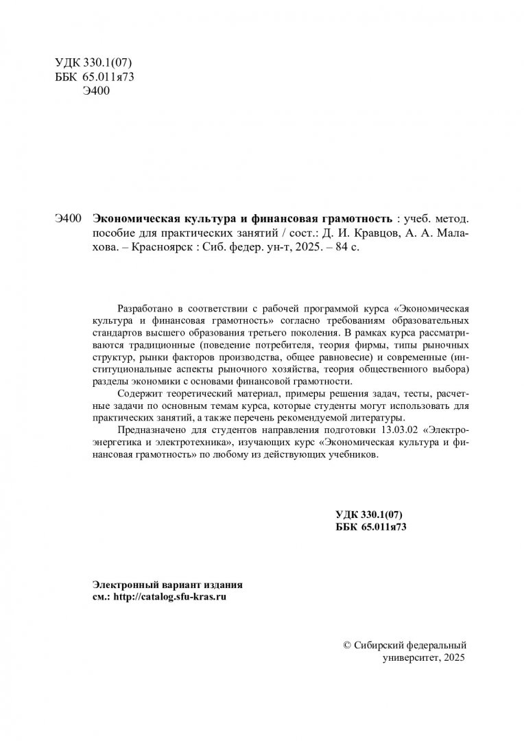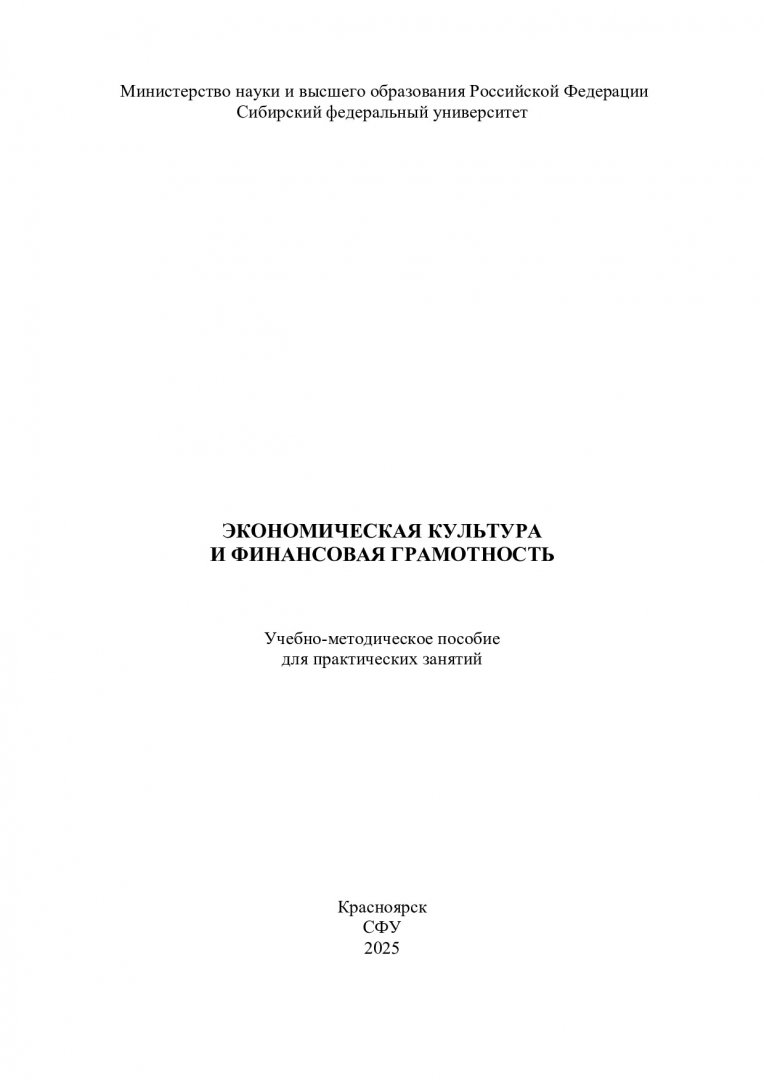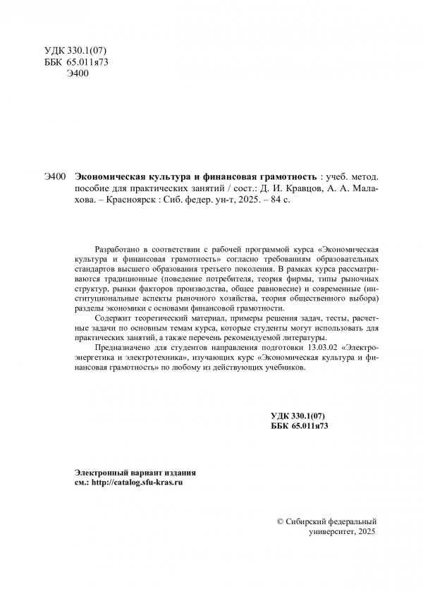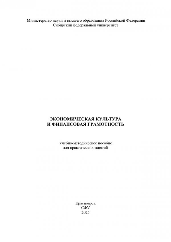 Библиографическое описание: Экономическая культура и финансовая грамотность : учебно-методическое пособие для практических занятий / Сибирский федеральный университет ; сост.: Д. И. Кравцов, А. А. Малахова. - Электрон. текстовые дан. (pdf, 2.7 Мб). - Красноярск : СФУ, 2025 (2025-11-10). - 84 с. - Загл. с титул. экрана. - Электрон. версия печ. публикации . - Библиогр.: с. 78-80. - 100 экз. - Изд. № 2025-25458 : Б. ц. - Текст : электронный.