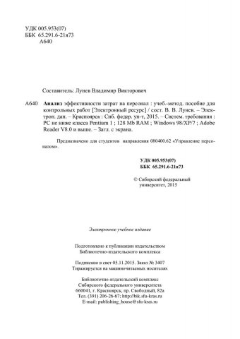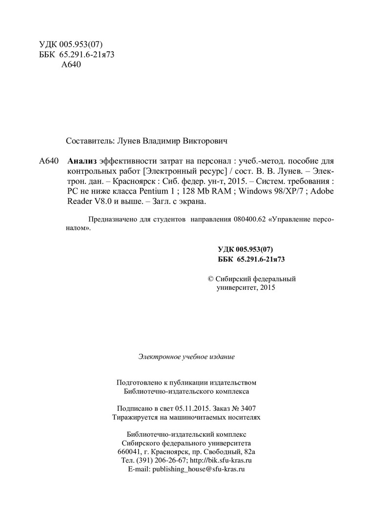 Библиографическое описание:Анализ эффективности затрат на персонал : учебно-методическое пособие для контрольных работ [для студентов напр. 080400.62 «Управление персоналом»] / Сиб. федер. ун-т, Ин-т упр. бизнес-процессами и экономики ; сост. В. В. Лунев. - Электрон. текст. данные (PDF, 0,5 Мб). - Красноярск : СФУ, 2015. - Загл. с титул. экрана. - Библиогр.: с. 9. - Изд. № 2015-3407. - Текст : электронный.